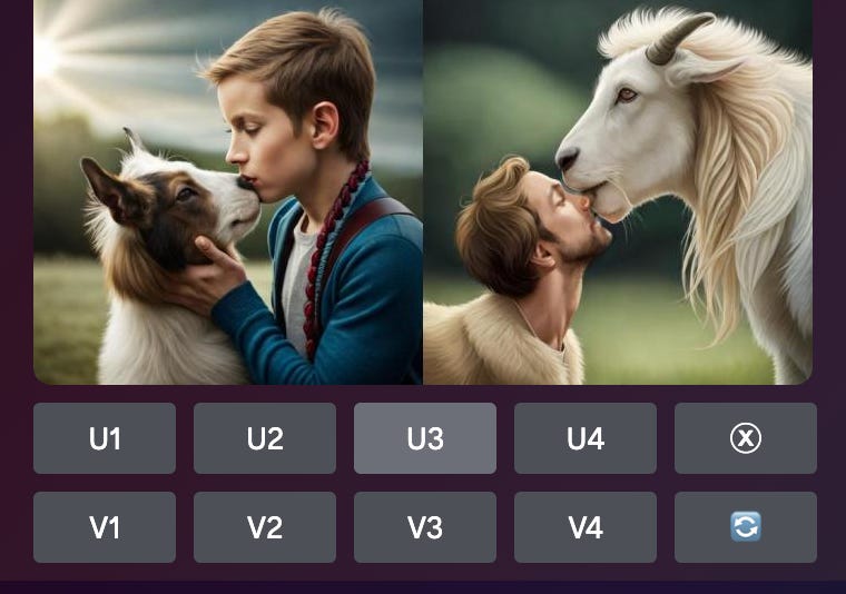 This is only 2 of the 4 images , the U1, U2, U3, U4 is used to select the image from top→left-right , bottom-left-right order, V1,V2,V3,V4 are used to create variations for the same. Blue button refreshes images completely without referencing previous images